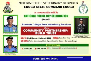“The Nigeria Police Force Veterinary Services of the command will conduct the exercise at the Police Veterinary Clinic, No. 3 Police Mobile Force (MOPOL 3) Squadron Base, Agbani Road, Enugu, from 9a.m. to 3p.m. daily.